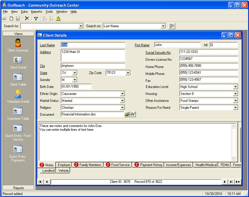 - Store demographic information on clients that you serve: name, address, phone, marital status, birth date, ethnic origin, social security number, drivers license number, education level, housing type, and employment information.